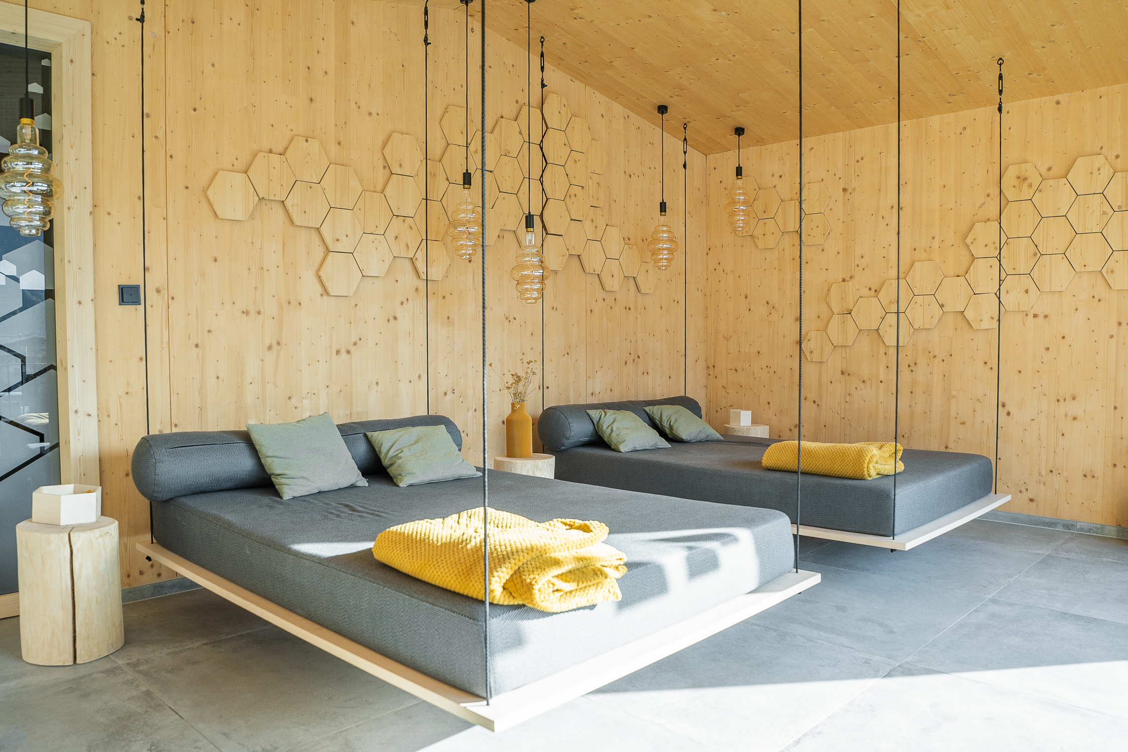 Ein besonderes Highlight war der Komplett-Entwurf und die Fertigung der Daybeds im Ruhebereich. Zudem statteten wir den Wellnessbereich mit maßgefertigten Liegematratzen, Auflagen für Hängebetten und dekorativen Kissen aus.